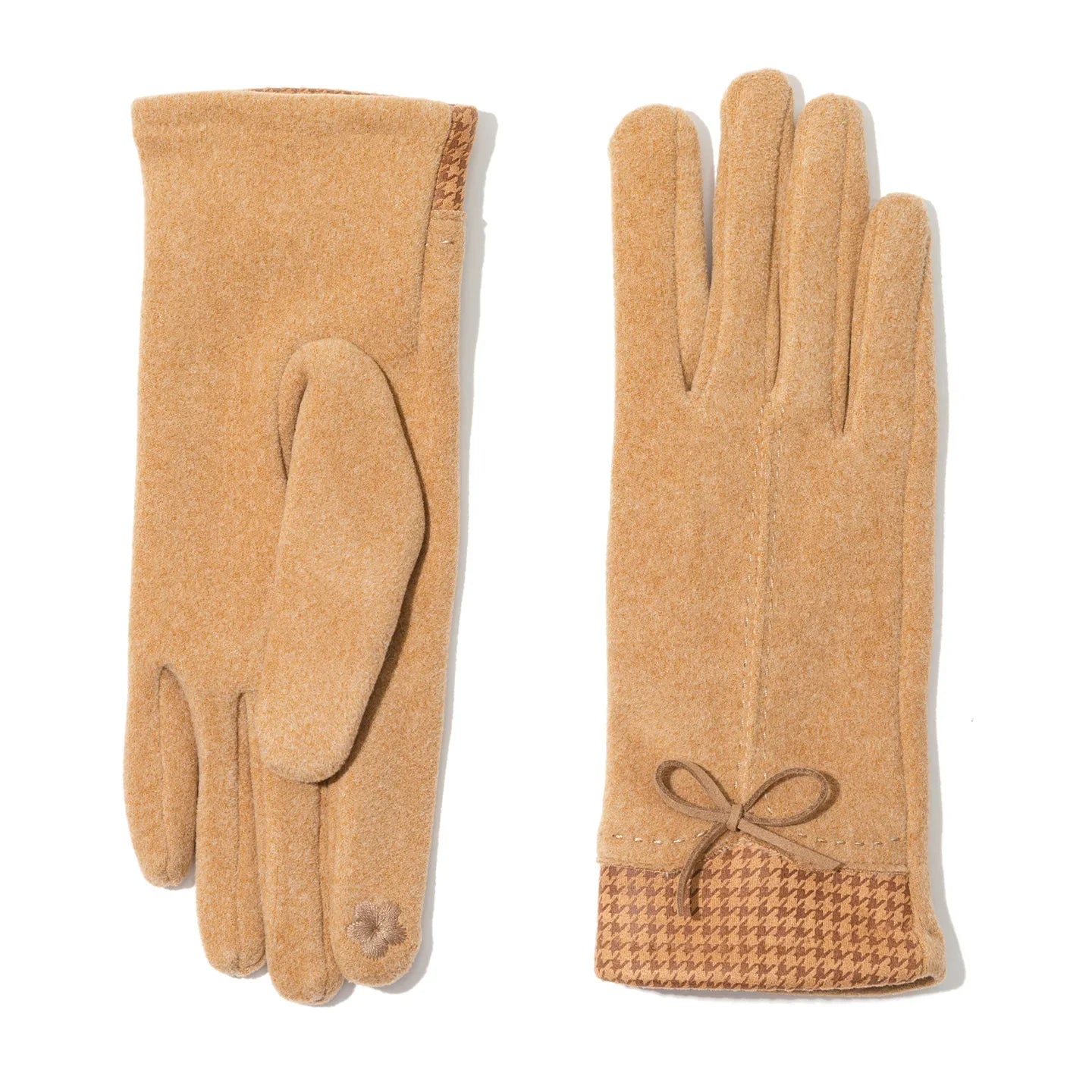 Mira gloves embody a timeless elegance while ensuring comfort, crafted from a soft wool blend with a delicate bow detail at the wrist. The houndstooth cuff introduces a refined contrast, complemented by practical touchscreen tips for convenience in colder weather.